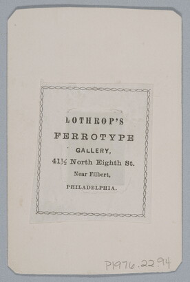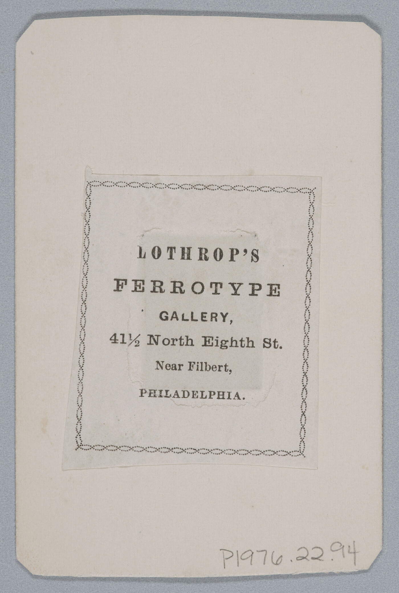 c. printed [on attached paper]: LOTHROP'S \ FERROTYPE \ GALLERY, \ 41 1/2 North Eight St. \ Near Filbert, \ PHILADELPHIA.