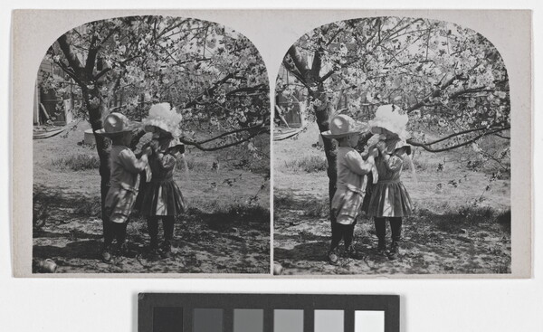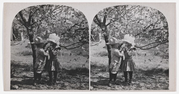 [Portrait of two children under a dogwood tree]