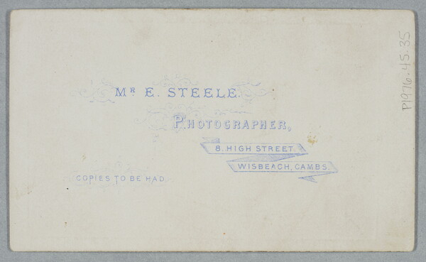 c. [vertical] printed: MR. E. STEELE. \ PHOTOGRAPHER, \ 8 HIGH STREET \ WISEBEACH, CAMB \ COPIES TO BE HAD