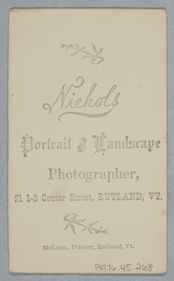 c. printed: Nichols \ Portrait & Landscape \ Photographer, \ 21 1-2 Center Street, RUTLAND, VT. \ McLean, Printer, Rutland, Vt.