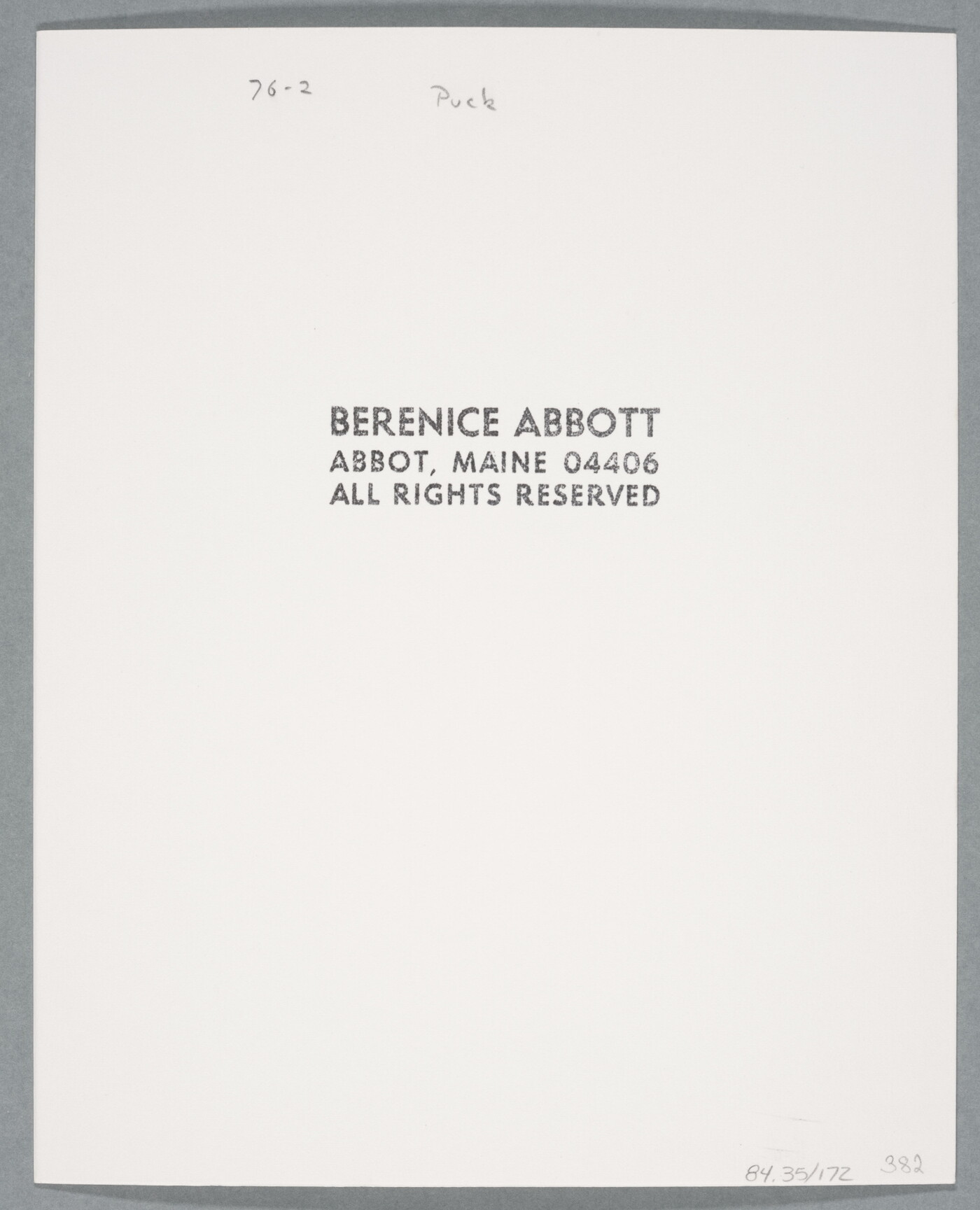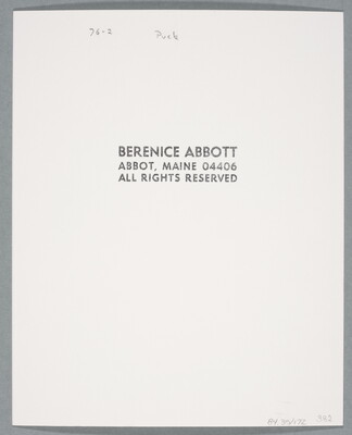c. [stamp]: BERENICE ABBOTT \ ABBOT, MAINE 04406 \ ALL RIGHTS RESERVED