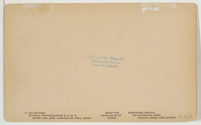 l.l. to l.r. printed: F JAY \ HAYNES, \ OFFICIAL PHOTOGRAPHER N. P. R. R. \ SELBY AVE., COR. VIRGINIA, ST. PAUL, MINN. \ SEND FOR \ CATALOGUE OF \ VIEWS. \ NORTHERN PACIFIC, \ YELLOWSTONE PARK, \ PACIFIC COAST AND ALASKA.