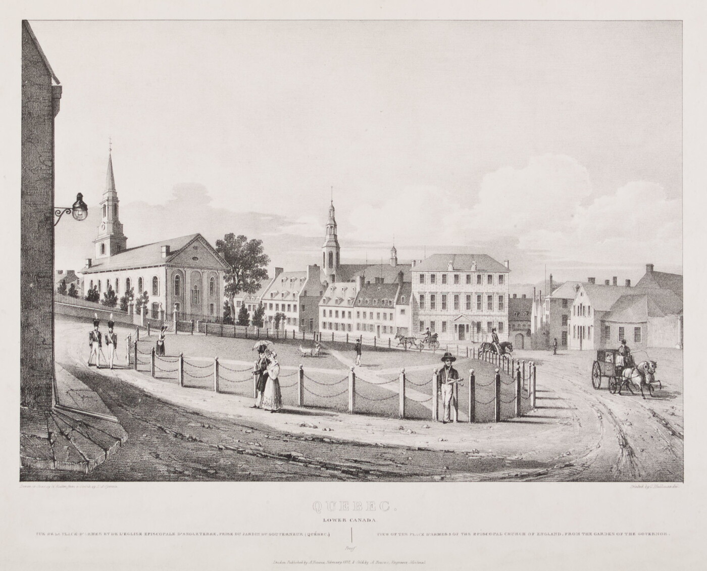 l.l.: Drawn on Stone by W. Walton, from a Sketch by R.A. Sproule. VUE DE LA PLACE D'ARMES ET DE L'EGLISE EPISCOPALE D'ANGLETERRE, PRISE DU JARDIN DU GOVERNEUR, (QUEBEC.)