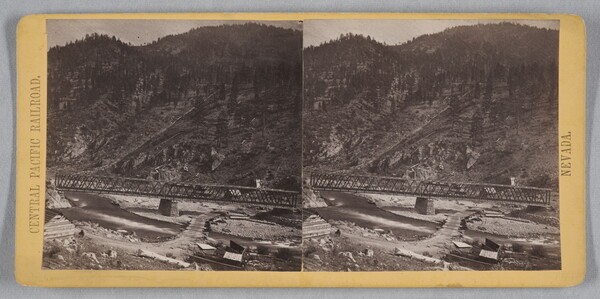 [Railroad bridge and log building in Sierra Nevada mountains]