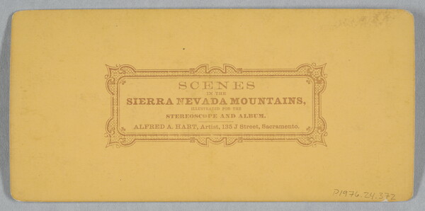 c. printed: SCENES \ IN THE \ SIERRA NEVADA MOUNTAINS, \ ILLUSTRATED FOR THE \ STEREOSCOPE AND ALBUM. \ ALFRED A. HART, Artist, 135 J Street, Sacremento.