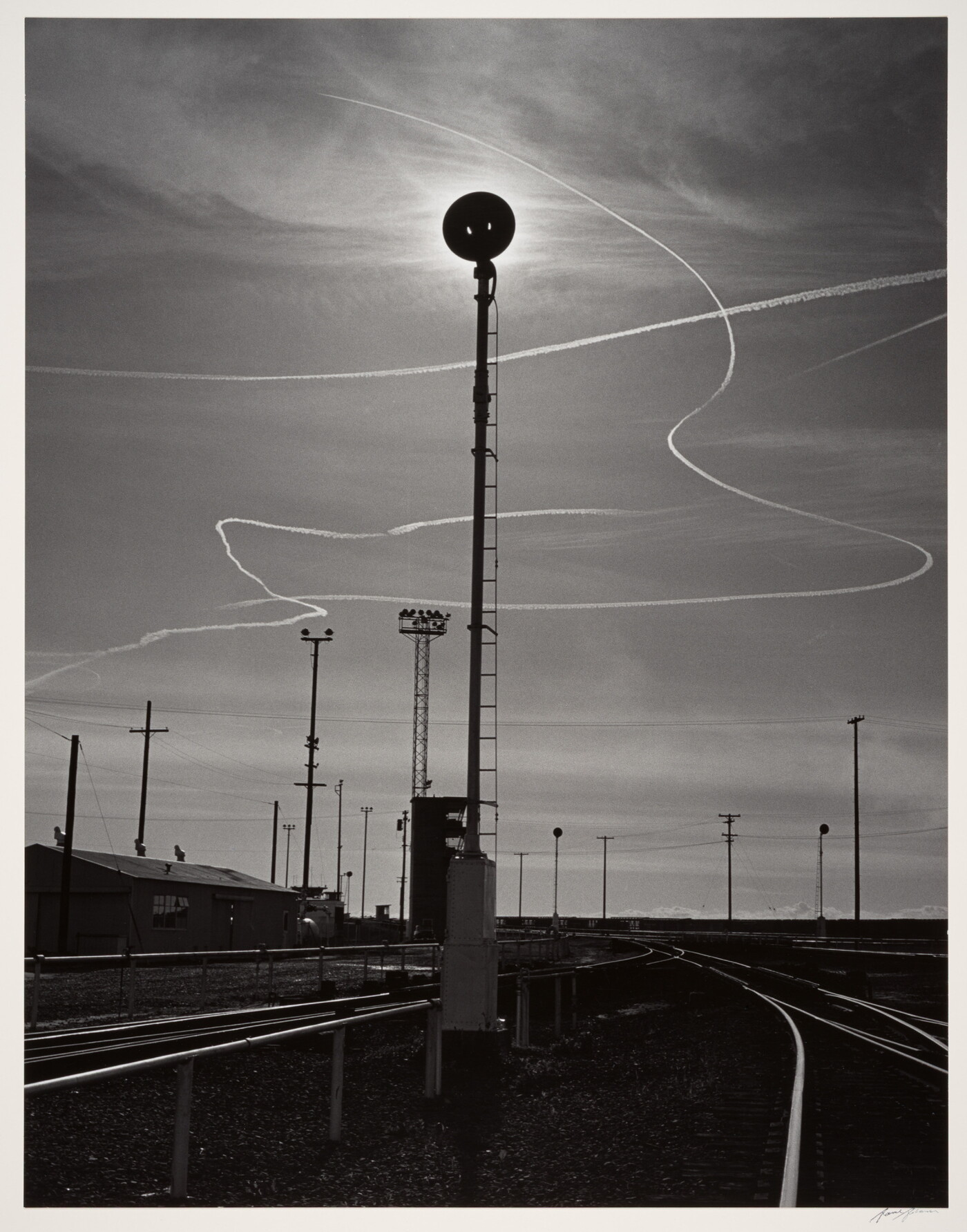 c. [stamp]: TITLE [ink ink] Rails and Jet trails, Roseville, California \ [stamp] CREDIT.....\ DATE..... FILM.....
