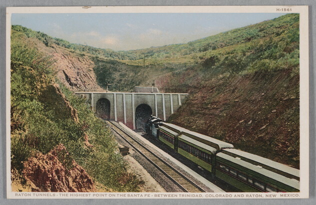l.l. to l.r. printed below image: RATON TUNNELS - THE HIGHEST POINT ON THE SANTA FE - BETWEEN TRINIDAD, COLORADO AND RATON, NEW MEXICO