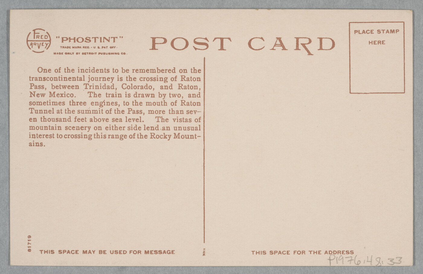 u.l. printed: FRED \ HARVEY "PHOSTINT" \ TRADE MARK REG U. S. PAT OFF. \ MADE ONLY BY DETROIT PUBLISHING CO.