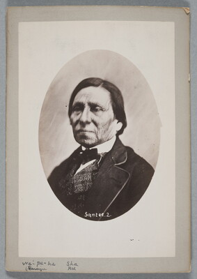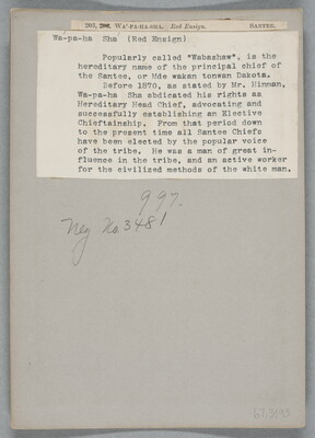 u.l. to u.r. printed on paper label: Wa-pa-ha Sha (Red Ensign) \ Popularly called "Wabashaw", is the \ hereditary name of the principal chief of \ the Santee, or Mde wakan tonwan Dakota. \ Before 1870, as stated by Mr. Hinman, \ Wa-pa-ha Sha abdicated his rights as \ Hereditary Head Chief, advocating and \ successfully establishing an Elective \ Chieftainship. From that period down \ to the present time all Santee Chiefs \ have been elected by the popular voice \ of the tribe. He was a man of great in- \ fluence in the tribe, and an active worker \ for the civilized methods of the white man.