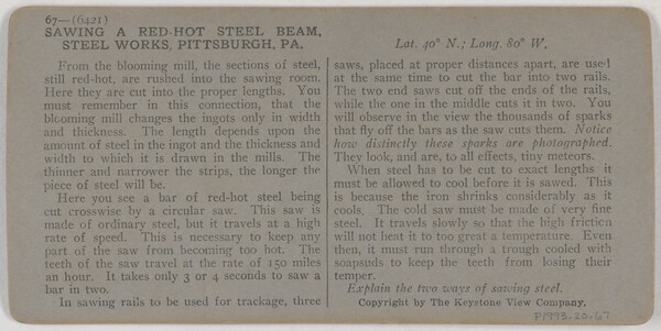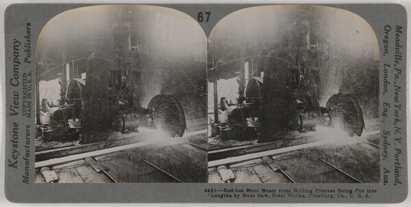 l.r. printed: 6421 - Red-hot Steel Beam from Rolling Process Being Cut into \ Lengths by Buzz, Saw, Steel Works, Pittsburg [sic], Pa., U.S.A.