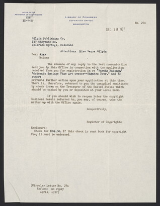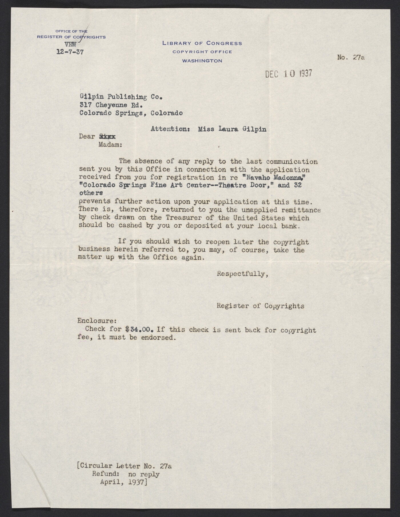 Typed document signed. Accompanies a check for $34.00 being returned to Gilpin to stop action on the copyright of thirty-four of Gilpin’s photographs. Attached is the check.