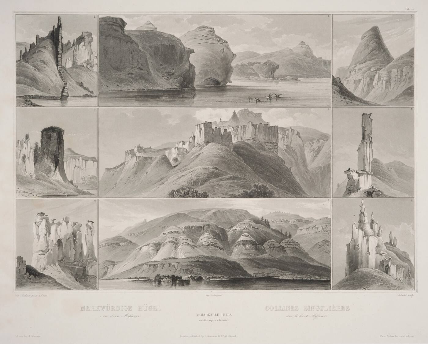 l.c.: Imp. de Bougeard \ MERKWÜRDIGE HÜGEL COLLINES SINGULIÈRES \ am obern Missouri REMARKABLE HILLS. sur la haute Missouri \ on the upper Missouri \ London, published by Ackermann & Co. 96 Strand \ [blind stamp] \