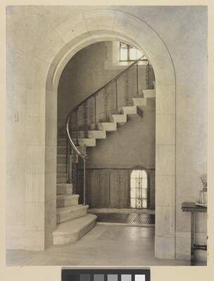 u.c. on paper label: [printed]: A : PHOTOGRAPH \ BY : LAURA : GILPIN \ TITLE [typed]: RESIDENCE OF MR.&MRS. L.M. \ HUGHES. \ STAIRWAY?. FROM ENTRANCE HALL. [printed]: COLORADO : SPRINGS : COLORADO