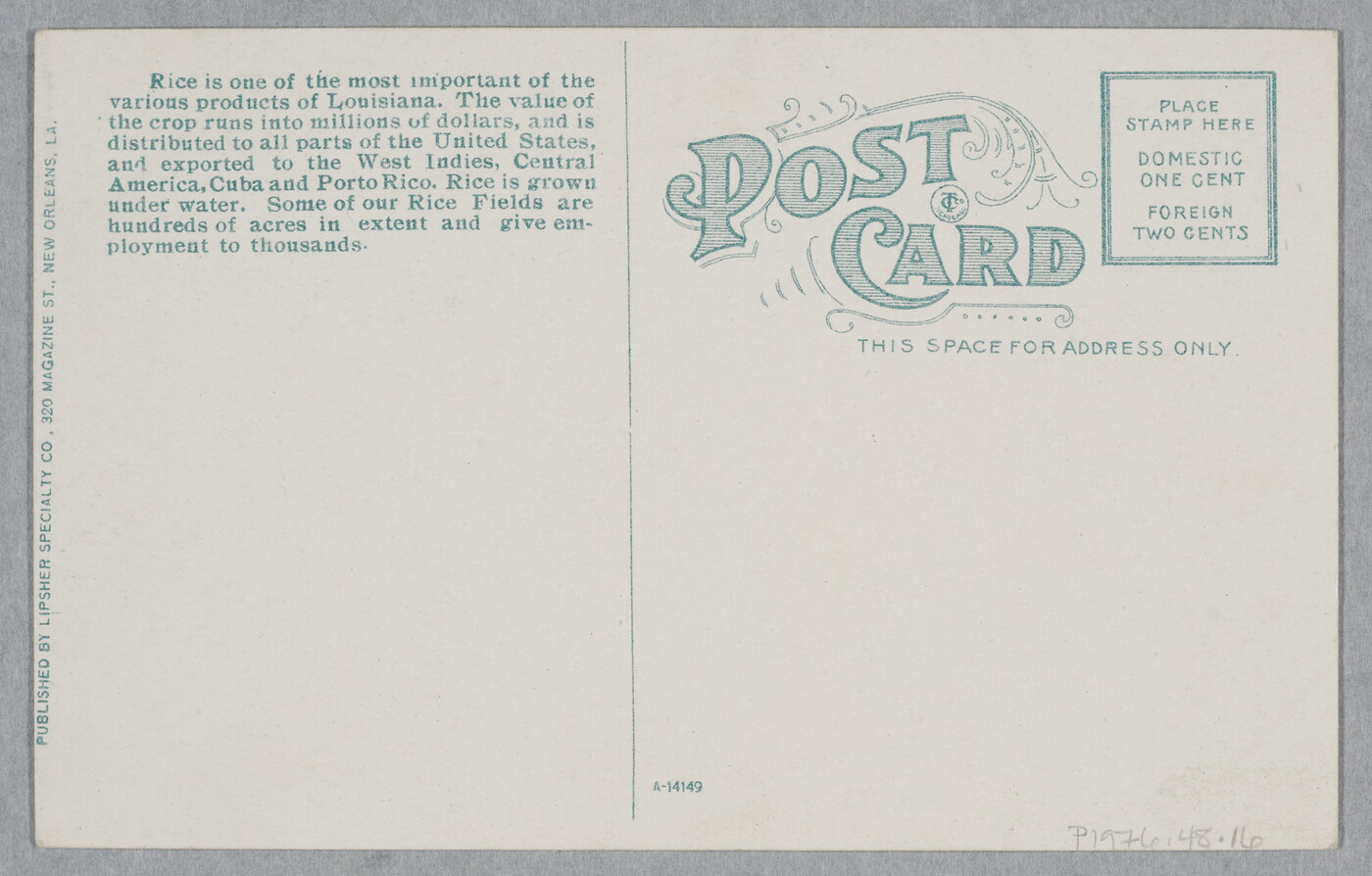 Inscriptions Recto; l.c. to l.r. printed in white: Rice, Ready for Export in Shed. New Orleans, La. Verso: u.l. printed: Rice is one of the most important of the \ various products of Louisiana. The value of \ the crop runs into millions of dollars, and is \ distributed to all parts of the United States, \ and exported to the West Indies, Central \ America, Cuba and Porto [sic] Rico. Rice is grown \ under water. Some of our Rice Fields are \ hundreds of acres in extent and give em- \ ployment to thousands. l.l. to u.l. printed along left edge: PUBLISHED BY LIPSHER SPECIALTY CO, 320 MAGAZINE ST., NEW ORLEANS, LA. l.c. printed: A-14149