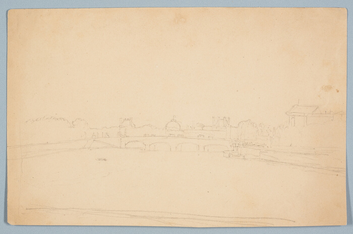 River with Four-Arched Bridge and City Buildings