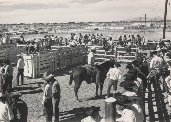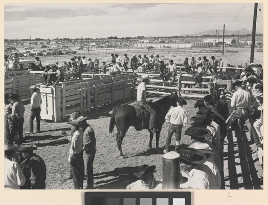 c. on paper label: [printed]: A PHOTOGRAPH BY \ LAURA GILPIN \ SANTA FE, NEW MEXICO \ [typed]: RODEO EVENTS AT SHIP ROCK \ From THE ENDURING NAVAHO \ University of Texas Press, Pub. 1968