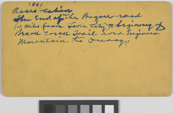 u.l. in ink: 1881 \ Roses Cabin \ The End of the Wagon Road \ (4 miles from Lake City) & beginning of \ [illeg.] Creek Trail over Engineer \ Mountain to Ouray.