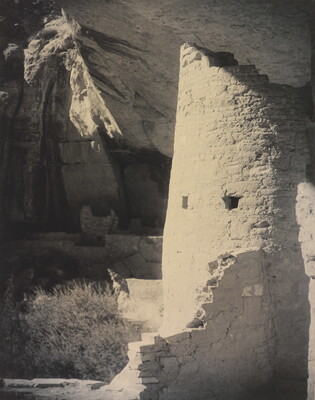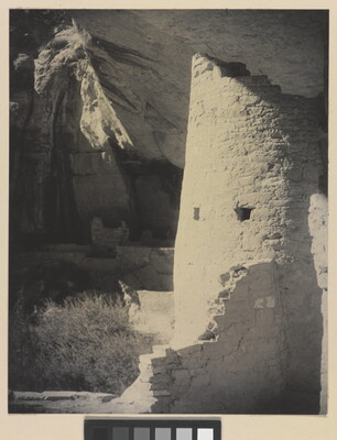 u.c. on paper label: [printed]: A : PHOTOGRAPH \ BY : LAURA : GILPIN \ TITLE [typed]: ROUND TOWER/ CLIFF PALACE. \ Copyright. \ The only tapering round tower \ in the Southwest. \ [printed]: COLORADO : SPRINGS : COLORADO