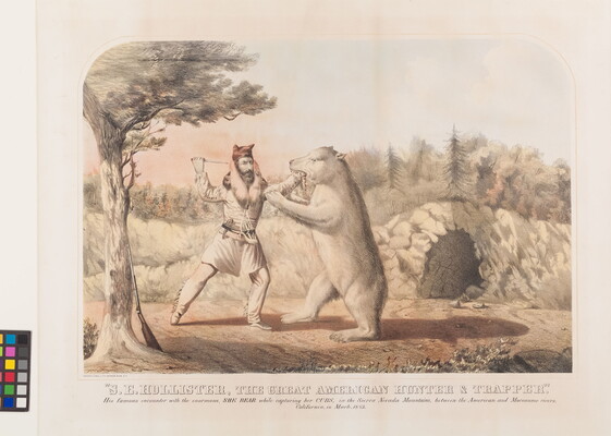 printed l.c.: "S.E. HOLLISTER, THE GREAT AMERICAN HUNTER & TRAPPER." \ HIS FAMOUS ENCOUNTER WITH THE ENORMOUS, SHE BEAR WHILE CAPTURING HER CUBS, IN THE SIERRA MOUNTAINS, BETWEEN THE AMERICAN AND MOCOSUME RIVERS, \ CALIFORNIA, IN MARCH, 1853.