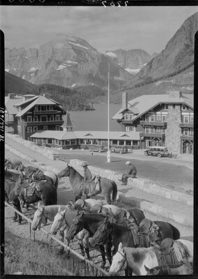 [Saddled horses at Glacier Park Lodge]