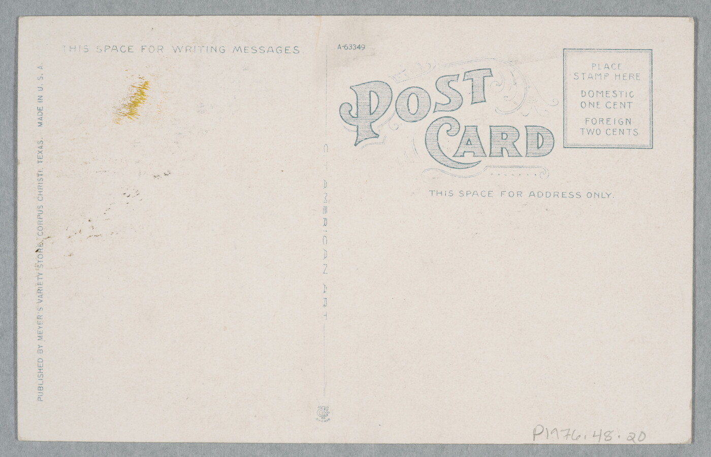 Inscriptions Recto: l.l. to l.c. printed, below image: SAILING ON CORPUS CHRISTI BAY, CORPUS CHRISTI, TEXAS. Verso: l.l. to u.l. printed along left edge: PUBLISHED BY MEYER'S VARIETY STORE, CORPUS CHRISTI, TEXAS. MADE IN U.S.A. u.c. printed: A-63349 c. printed [transverse]: C.T. AMERICAN ART l.c. printed: [Curt Teich logo]