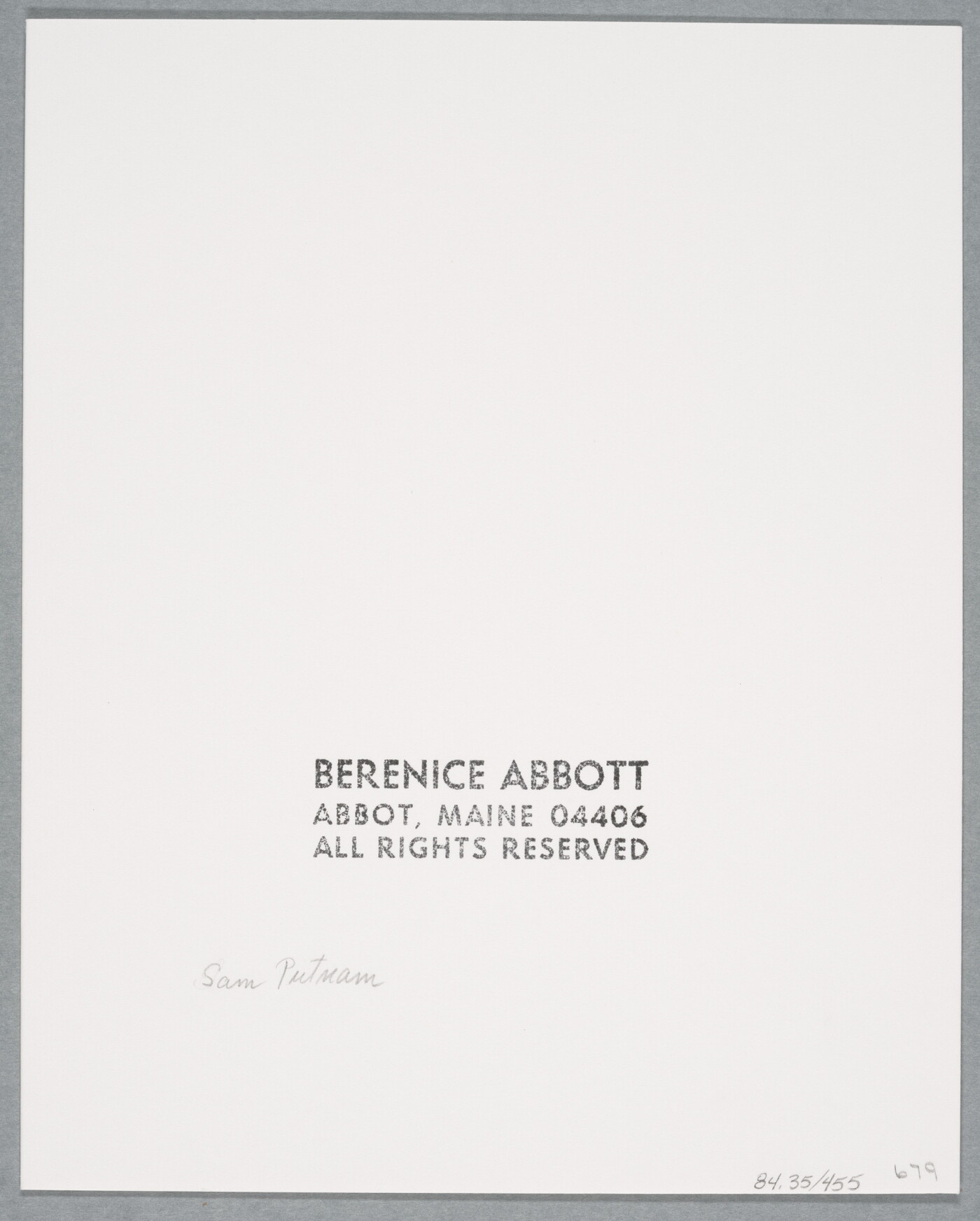 c. stamp: BERENICE ABBOTT \ ABBOT, MAINE 04406 \ ALL RIGHTS RESERVED