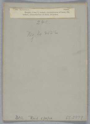u.l. to u.r. printed on paper: 862. SAYGULLY. PINAL. \ Height, 5 feet 7 1/4 inches; circumference of head 22 1/4 \ inches; circumference of chest, 36 inches.