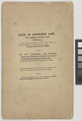 c. [label]: SCENE IN GERONIMO'S CAMP, \ The Apache Outlaw and \ Murderer. \ Taken before the surrender to Gen. Crook, March 27, \ 1886, in the Sierra Madre mountains of Mexico, \ Escaped March 30, 1886 \ No. 171- Geronimo and Natches \ mounted, Natches with hat on; son of \ Geronimo standing by his side. \ This group was taken by special request of Geronimo. \ The requirements of law having been complied with, \ all persons are warned not to copy this photograph. \ Address all orders to C.S. Fly, Portrait and Land- \ scape Photographer, Tombstone, Arizona.