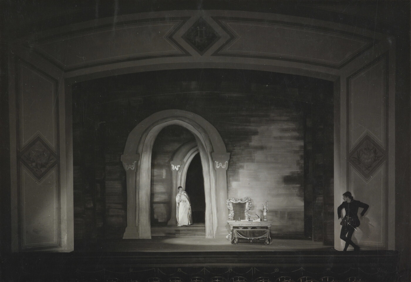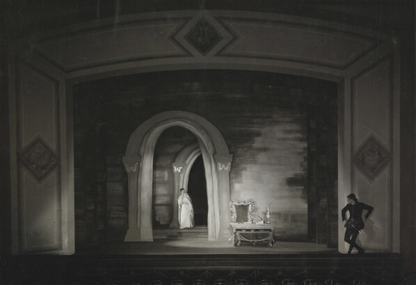 u.c. on paper label: [printed]: A PHOTOGRAPH \ LG \ By LAURA GILPIN \ COLORADO SPRINGS . COLORADO \ TITLE: [typed]: CENTRAL CITY OPERA HOUSE ASSON. \ WALTER HOUSTON IN OTHELLO. \ ASSIGNMENT FOR ASSO. AND ROBERT \ EDMOND JONES. \ REQUIREMENTS ON ALL THIS C.C. WORK \ WAS TO HOLD EXACT STAGE LIGHTING.