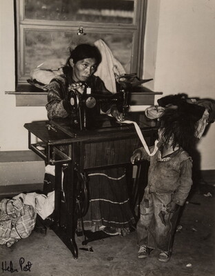 c. in graphite: At the day schools, sewing machines and laundry equiptment \ are available for parents to use. Women gather in groups \ to use these and the teacher has an excellent opportunity \ to see those who need medical care and help them \ overcome their traditional resistance against hospitals and \ doctors. Notice child has rag around it's \ neck which could mean a throat \ condition - but he may be old enough \ to play cowboy.