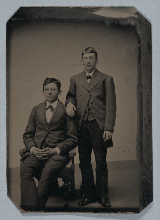 [Two young men in suits, one standing, one seated, full-length], late 1870s-1880s