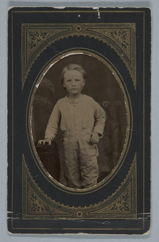 [Small boy, possibly Devizes Keans, standing with thumb in knickers pocket or flap, full-length], 1877
