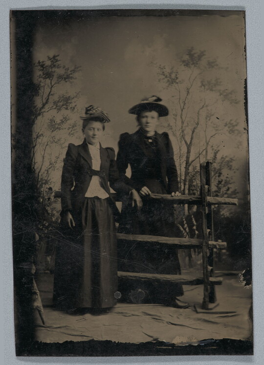 [Two women in hats, standing, full-length], 1890s