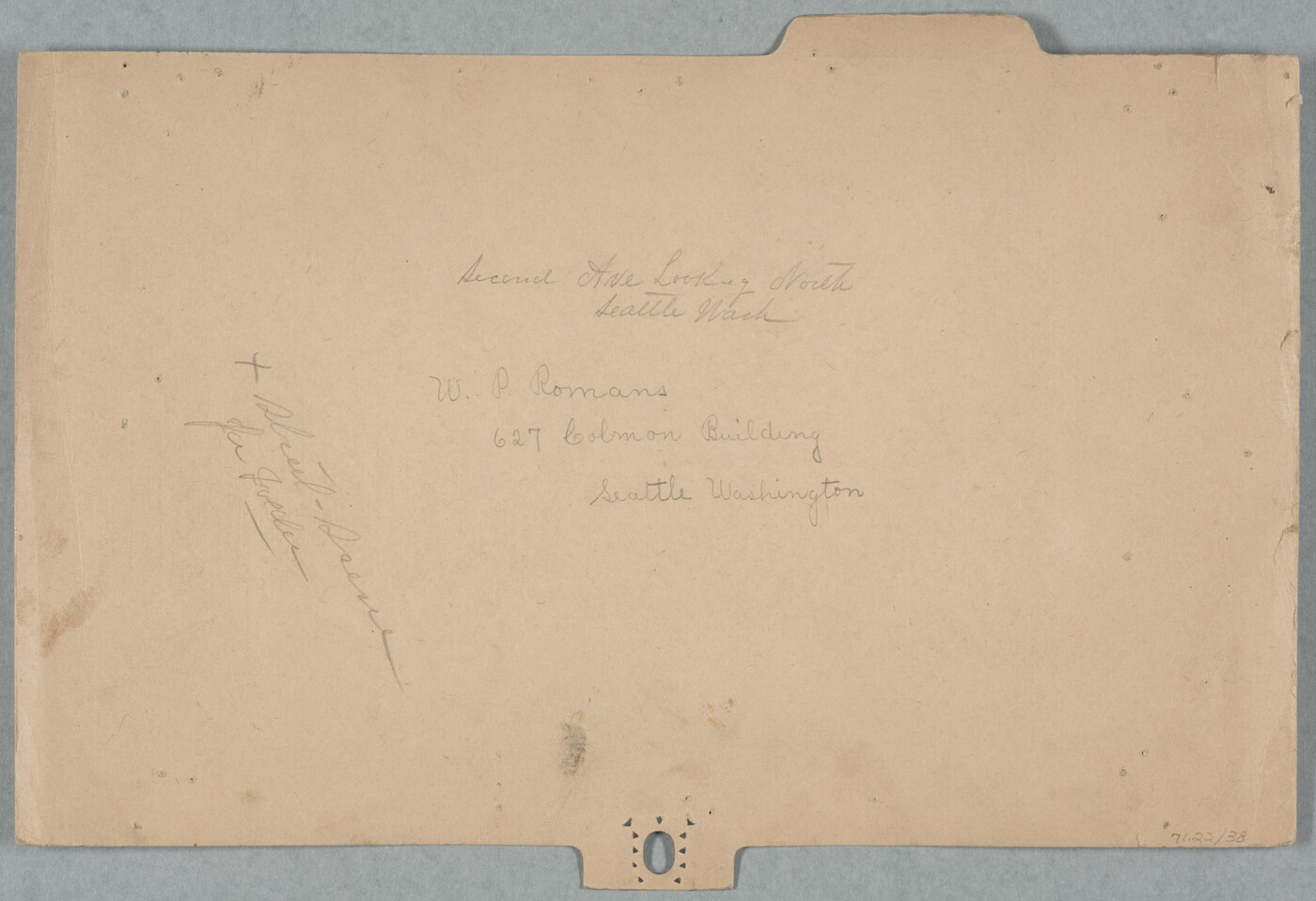 c. vertical in graphite: Second Ave Looking North \ Seattle Wash \ W.P. Romans \ 627 Colmon Building \ Seattle Washington