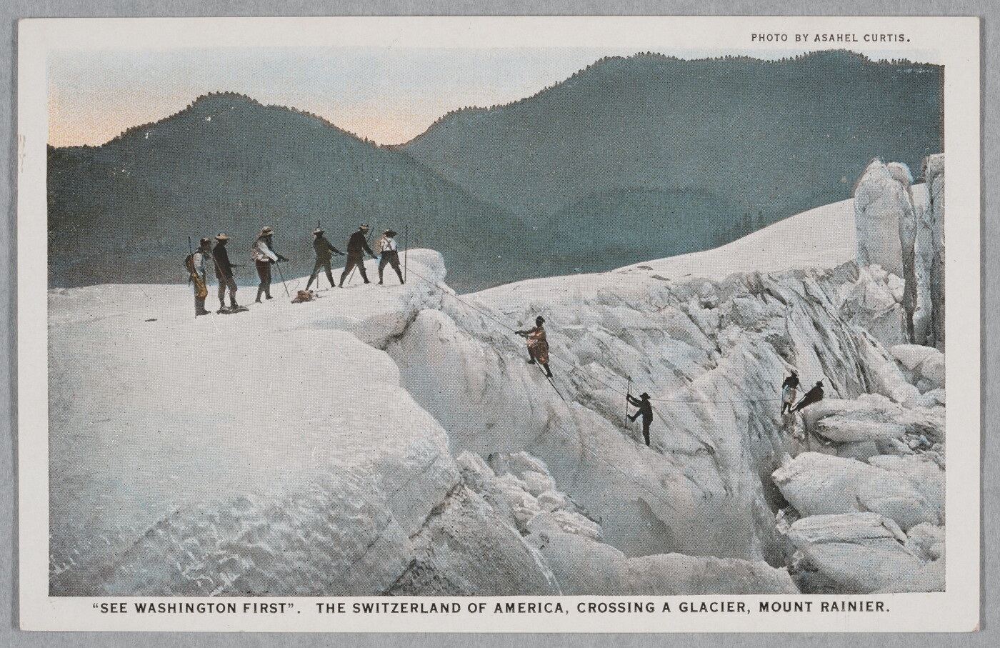 l.l. to l.r. printed in black, below image: "SEE WASHINGTON FIRST." THE SWITZERLAND OF AMERICA, CROSSING A GLACIER, MOUNT RAINIER.