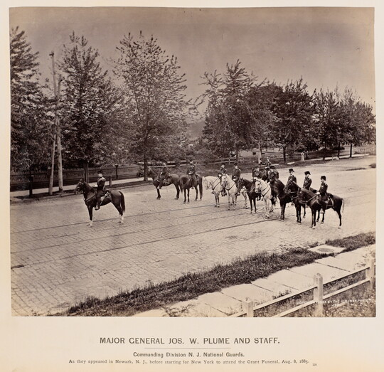 Major General Jos. W. Plume and Staff Commanding Division N.J. National Guards. As they appeared in Newark, N.J., before starting for New York to attend the Grant Funeral, Aug. 8, 1885., 1885