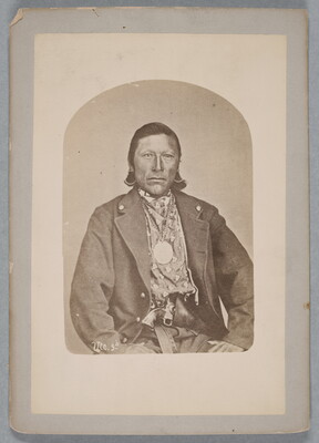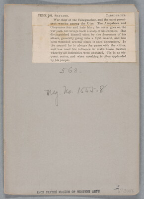 u.c. printed on paper label: 772-3, [crossed out] 781. SHAVANO. TABEGUACHE. \ War chief of the Tabeguaches, and the most promi- \ nent warrior among the Utes. The Arapahoes and \ Cheyennes fear and hate him; he never goes on the \ war-path but brings back a scalp of his enemies. Has \ distinguished himself often by the fierceness of his \ attack, generally going into a fight naked, and has \ been wounded several times in such encounters. In \ the council he is always for peace with the whites, \ and has used his influence to make those treaties \ whereby all difficulties were obviated. He is an elo- \ quent orator, and when speaking is often applauded \ by his people.