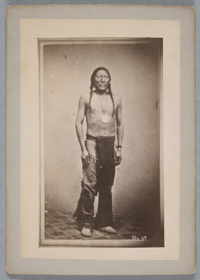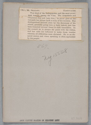 u.c. printed on paper label: 773. SHAVANO. TABEGUACHE. \ War chief of the Tabeguaches, and the most promi- \ nent warrior among the Utes. The Arapahoes and \ Cheyennes fear and hate him; he never goes on the \ war-path but brings back a scalp of his enemies. Has \ distinguished himself often by the fierceness of his \ attack, generally going into a fight naked, and has \ been wounded several times in such encounters. In \ the council he is always for peace with the whites, \ and has used his influence to make those treaties \ whereby all difficulties were obviated. He is an elo- \ quent orator, and when speaking is often applauded \ by his people.
