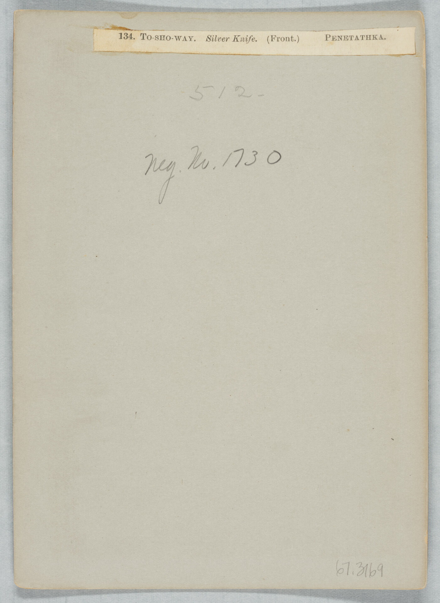 u.c. to u.r. printed on paper label: 134. TO-SHO-WAY. Silver Knife. (Front.) PENETATHKA.