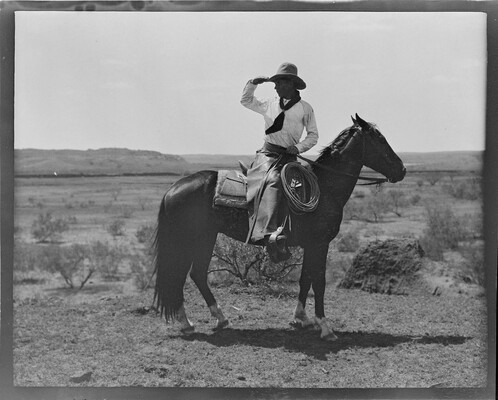A Shoe Bar cowboy shading his eyes looks backward into the bright sunlight. Shoe Bar Ranch, Texas.