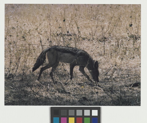 u.l. [stamp]: PHOTOGRAPH \ By \ ELIOT PORTER \ No. [in ink]: Roll 146, No. 37 \ [stamp]: Title [in ink]: Silver-backed Jackal \ Serengeti, Tanzania \ 1970