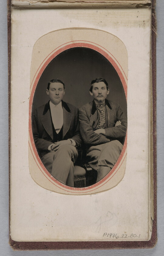 [Two men seated, one with arms crossed, three-quarter length], 1870s-1880s