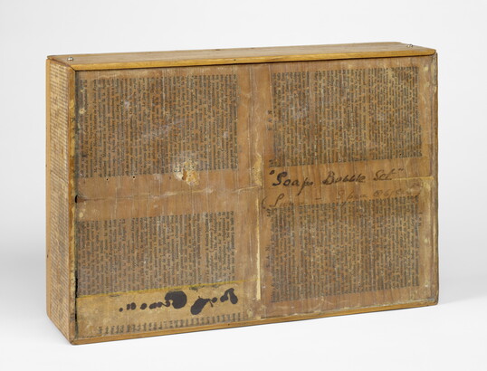 In the mid-1930s, Cornell embarked on his Soap Bubble Sets—small shadowboxes filled with objects that carried metaphorical associations with astronomy. Juxtaposed against a photograph of the moon, the seashell included in this set suggests tides and the moon’s gravitational pull, while the ring and ball suspended on rails recall the path of the moon’s orbit. The other objects hint at more cryptic meanings. Though related to certain scientific principles, the work is personal and mysterious, signaling Cornell’s romantic response to the study of the cosmos.
