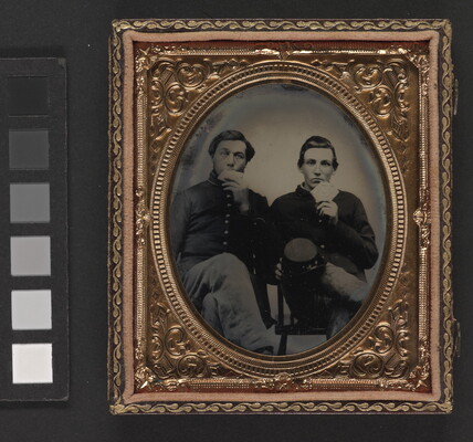 That might be where this image of two Union soldiers was taken. Their faces are serious but they perform for the camera, pretending to eat hardtack, the cheap and long-lasting crackers that sustained surveyors, gold miners, and soldiers. Demand for photographs accelerated during the Civil War, as both soldiers and those they left behind sought souvenirs of their loved ones.