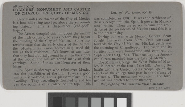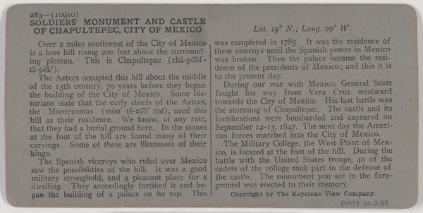 l.r. printed: 10910 - Soldiers' Monument and Castle of Chapultepec, City \ of Mexico.
