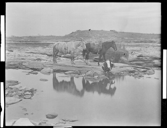 Edwin Sanders dipping a drink with the rolled brim of his hat while his mount and packhorse stand nearby. ED Ranch, near Crowell, Texas., 1906