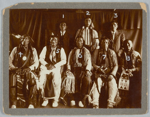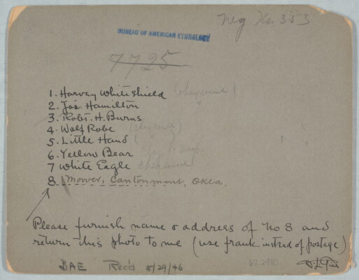 c.l. in ink: l. Harvey White Shield [in graphite] (Cheyenne) \ [in ink] 2. Jos. Hamilton [in graphite] " \ [in ink] 3. Robt. H. Burns \ 4. Wolf Robe [in graphite] (Cheyenne) \ [in ink] 5. Little Hand [in graphite] ( " ) \ [in ink] 6. Yellow Bear [in graphite] Chey or Arap. \ [in ink] 7. White Eagle [in graphite] Cheyenne \ [in ink] 8 Mower, Cantonment, Okla.