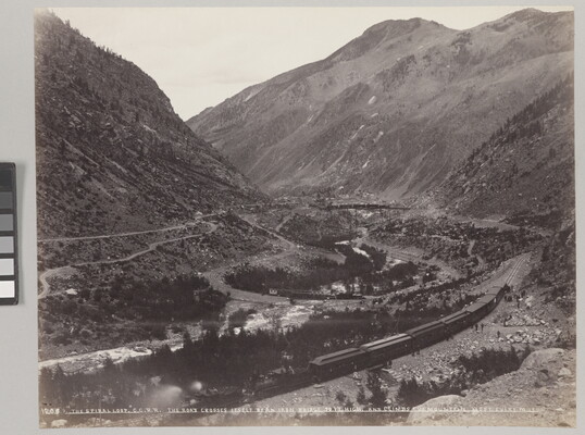 l.l. to l.r. in negative: 1208 "THE SPIRAL LOOP" C.C.R.R. THE ROAD CROSSES ITSELF BY AN IRON BRIDGE 20 FT HIGH, AND CLIMBS THE MOUNTAIN 250 FT EVERY MILE