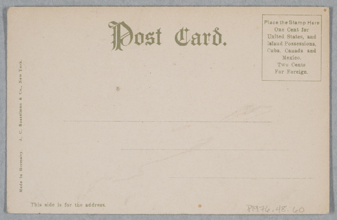 l.l. to c.l. printed along left edge: Made in Germany. A.C. Bosselman & Co., New York.