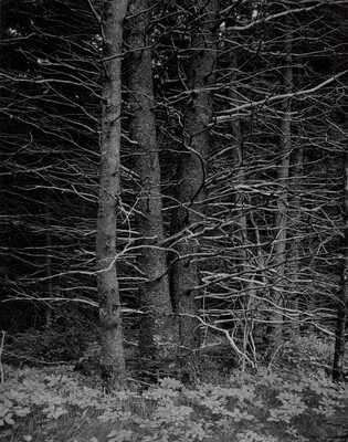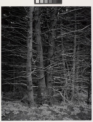u.l. on paper label: [printed]: PARRISH ART MUSEUM - EXHIBITION LABEL \ SOUTHAMPTON, NEW YORK 11968 \ EXHIBITION [typed]: THE PORTER FAMILY \ [printed]: DATE [typed]: May 18 - July 13, 1980 \ [printed]: ARTIST [typed]: Eliot Porter \ [printed]: TITLE [typed]: SPRUCE TREES, MAINE, 1934 \ [printed]: MEDIUM [typed]: photograph \ [printed]: LENDER [typed]: Artist \ [printed]: MUSEUM NUMBER
